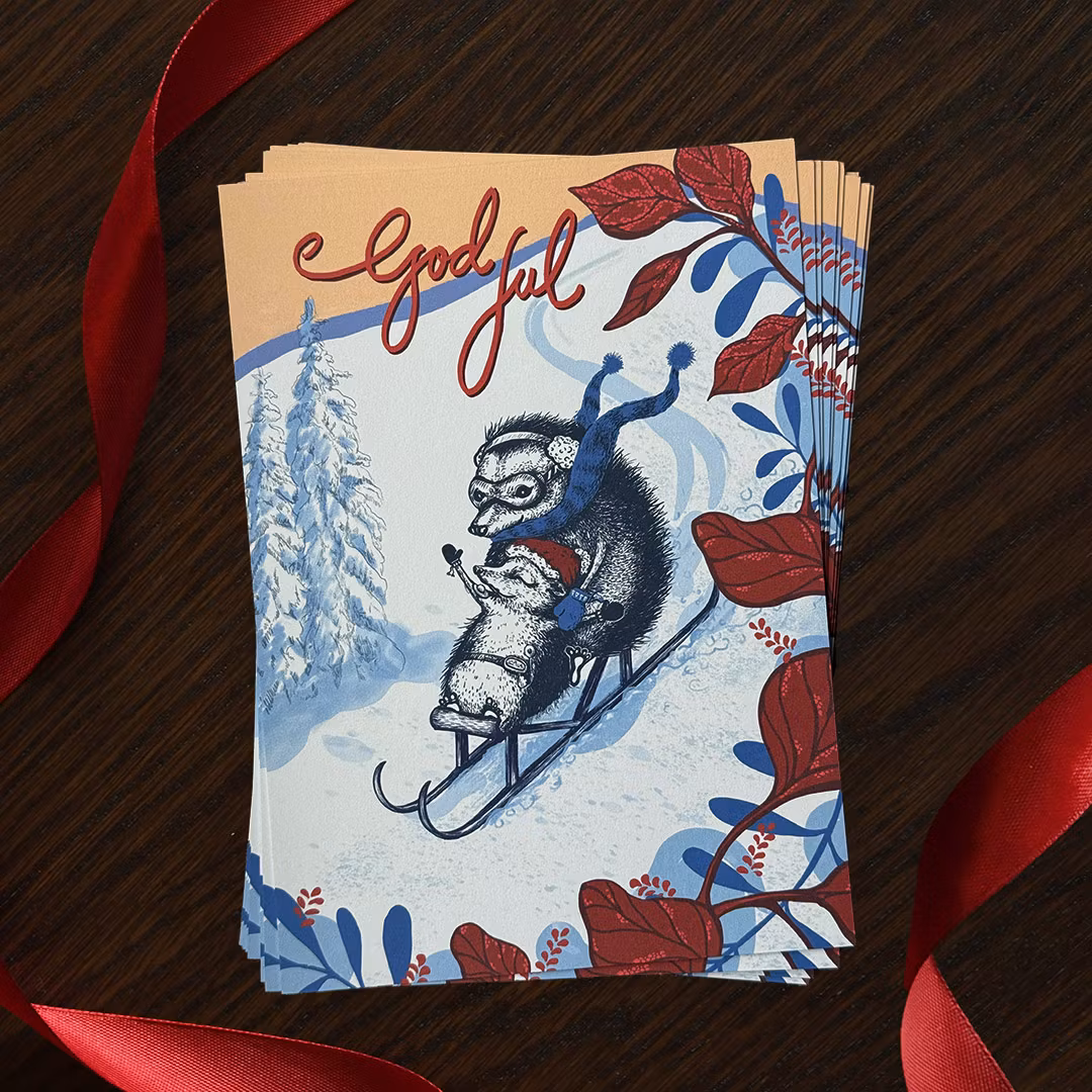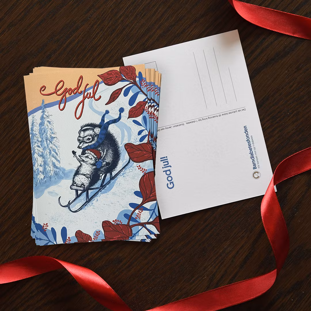 Skicka Barndiabetesfondens fina julkort till dina nära och kära – samtidigt som du bidrar till forskningen kring typ 1-diabetes. Motivet föreställer igelkottarna Sticke (med pump och sensor) och hans mamma som åker kälke i backen. Motivet är illustrerat av Jenny von Döbeln.