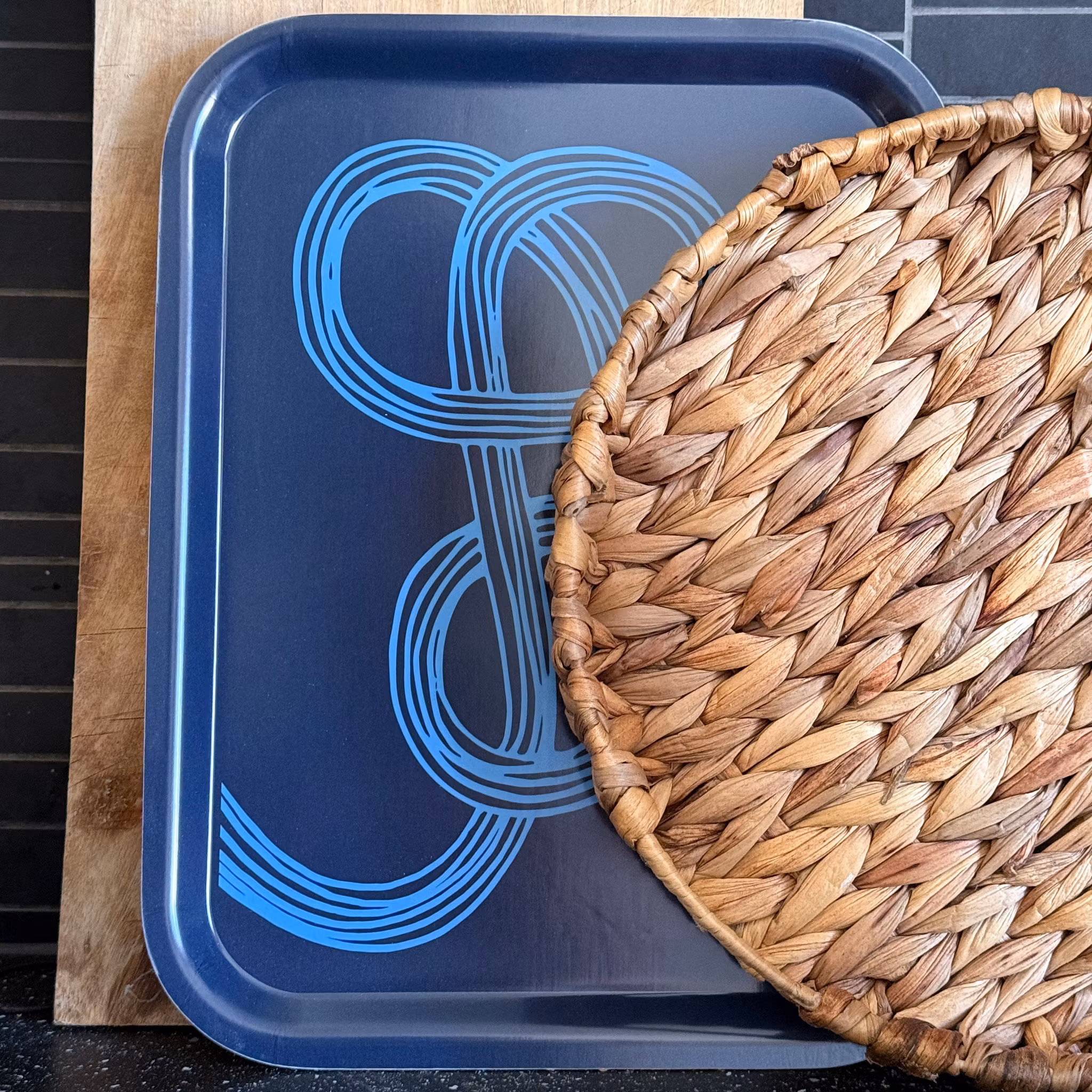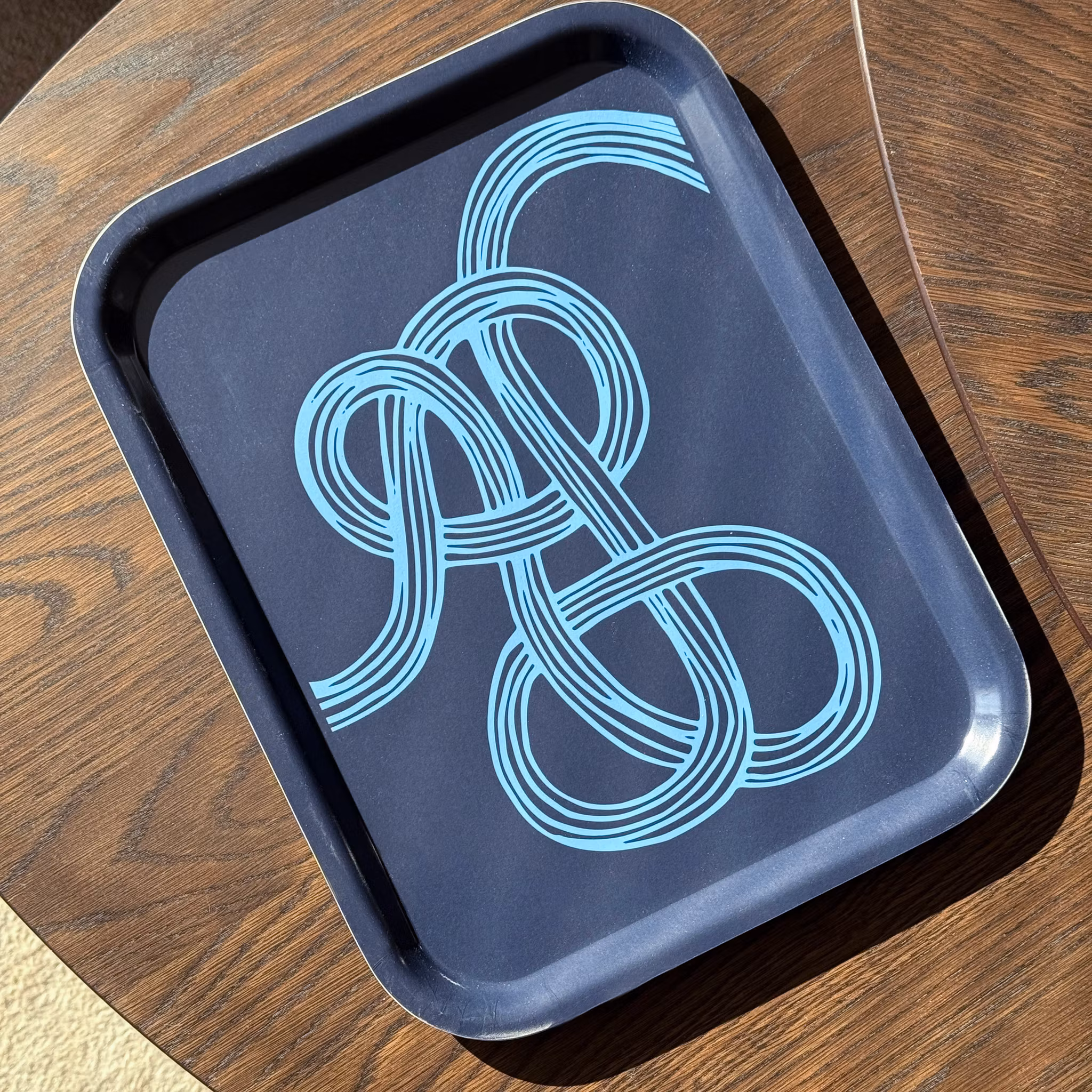 Bricka i trä med tryck. Motivet är en tolkning av en olöst knut, skapad av Susanne Engman för Barndiabetesfonden.