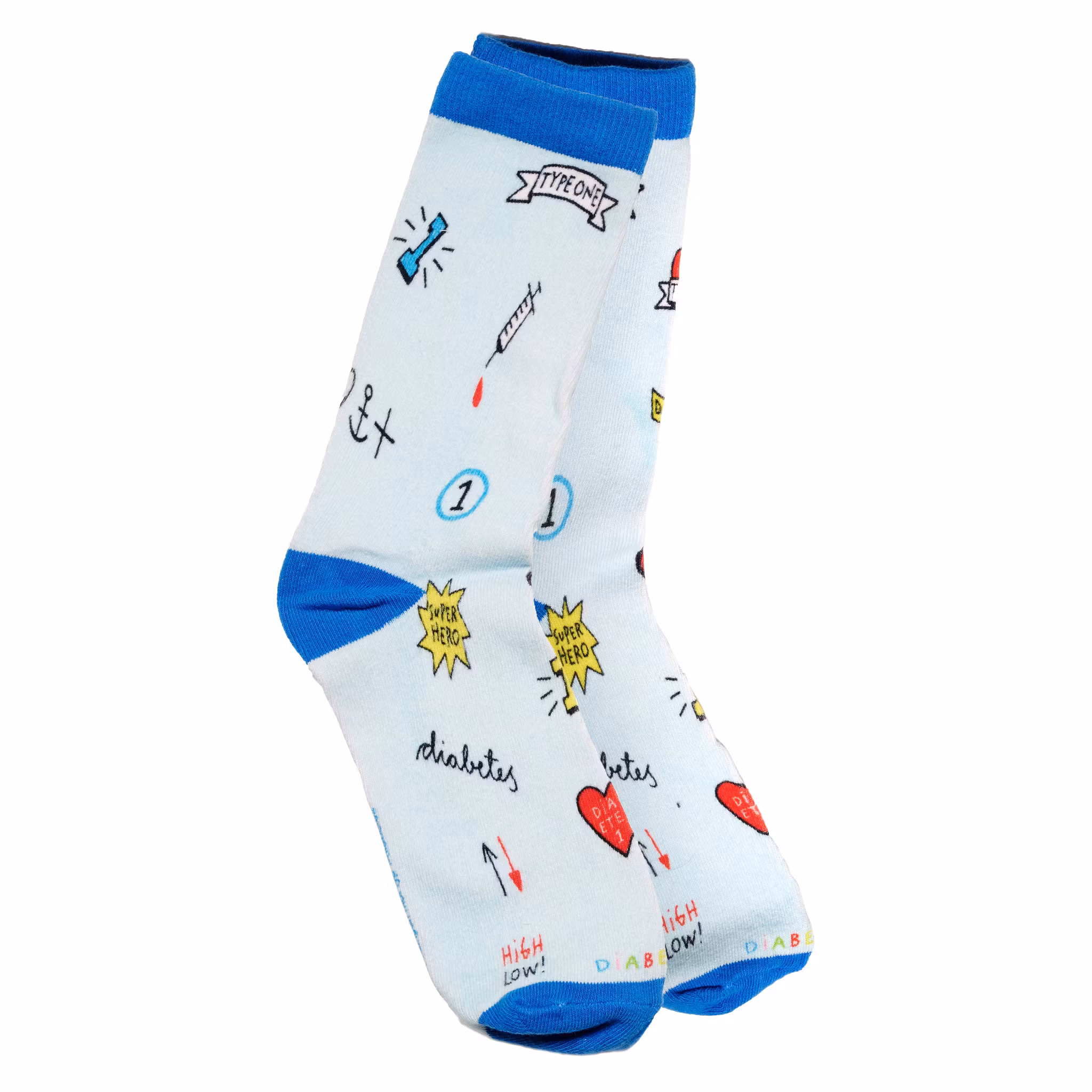 Strumpor i hög modell med olika ikoner med koppling till typ 1-diabetes. Finns i storlekarna 35-40 samt 41-46
